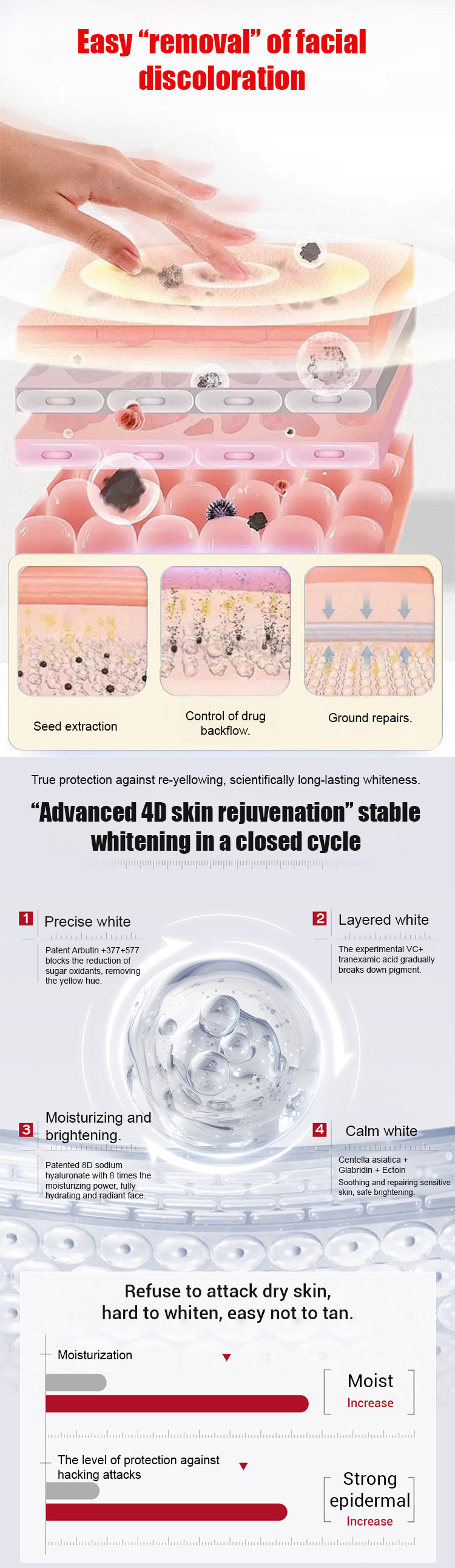 🌿 Featuring a dual core of Arbutin 7.0 and Niacinamide 4.0, combined with VC, 377, 577, and tranexamic acid to precisely block melanin production; also contains Centella asiatica and rosemary extracts for soothing and repairing the skin. 💧 Contains 8D hyaluronic acid for 24-hour moisture retention and fast absorption in 3 seconds.
