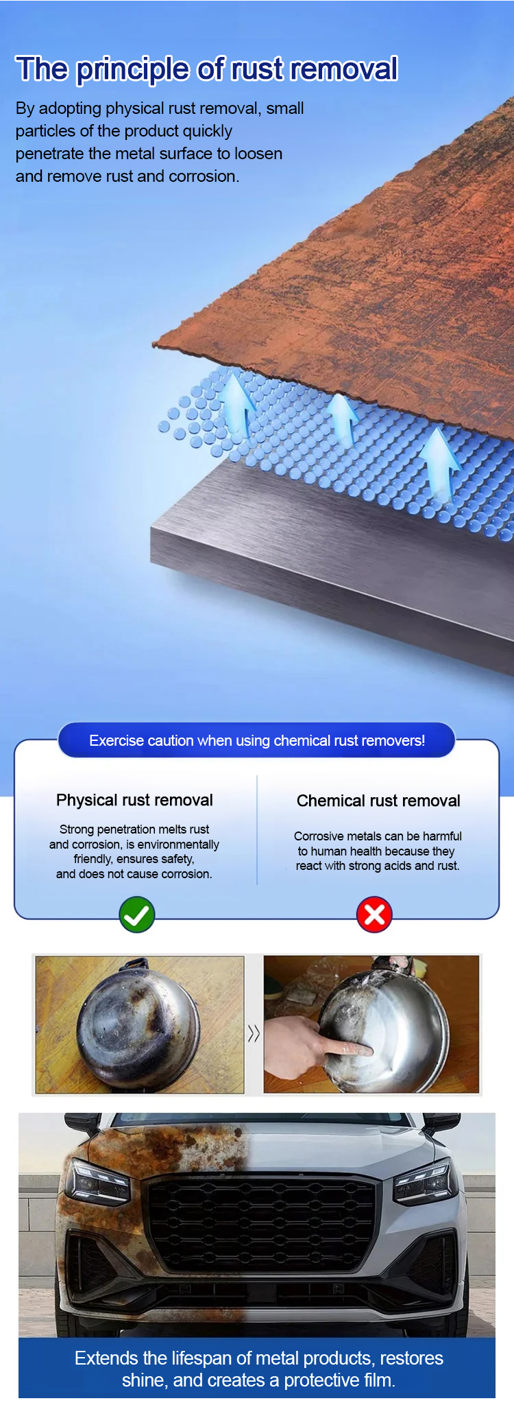 The ultra-strong steel rust remover and protector not only removes rust, but also eliminates stubborn stains – restoring the metal to its original shine and brightness!